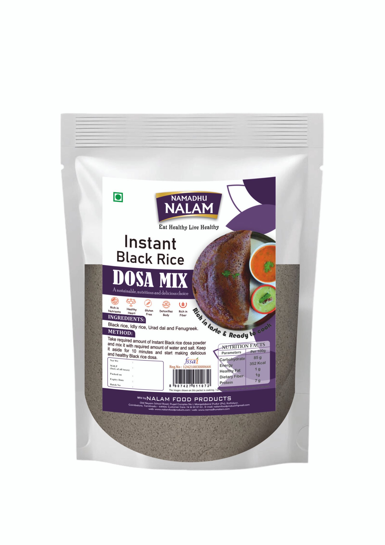 Black rice is commonly known for its Rich antioxidants, particularly anthocyanins, which help combat oxidative stress. High in dietary fiber, promoting digestive health and aiding in weight management. Low glycemic index, beneficial for blood sugar control.Gluten-free, suitable for those with gluten sensitivity. Black rice dosa mix offers a healthy and convenient alternative to traditional dosa batters. Nalam black rice dosa mix is made from good quality black rice, urad dhal and some spices to enhance its taste with no added colour and preservatives. The best breakfast option to start your day in a healthy way.