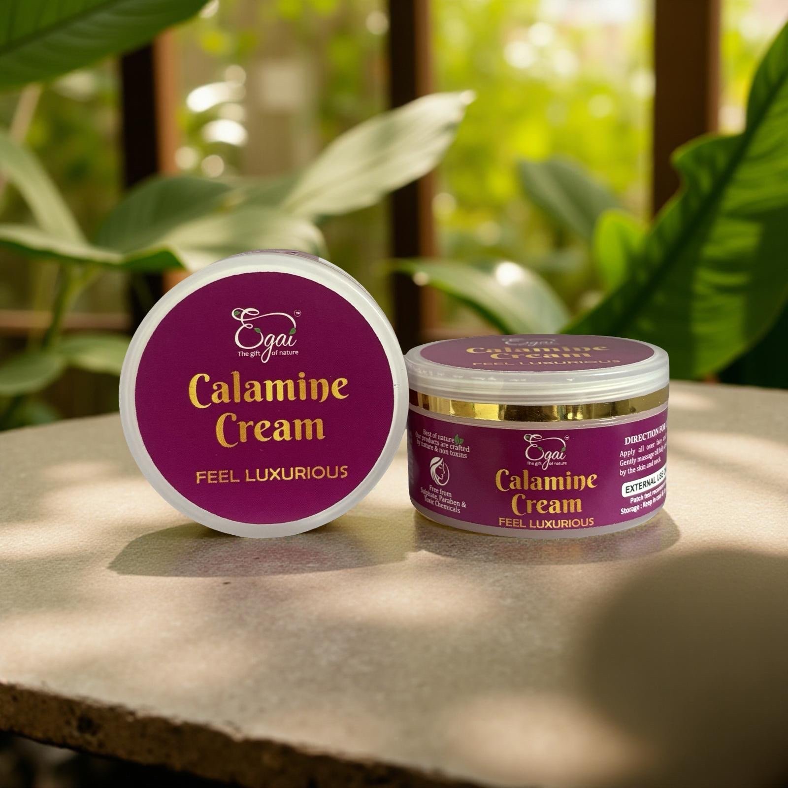 Egai calamine cream made from natural ingredients. to comfort your skin from sun and pollution. Calamine cream is an over-the-counter topical medication primarily used as a skin protectant to relieve itching, pain, and discomfort from minor skin irritations. It is composed of zinc oxide and ferric oxide, which provide its characteristic pink colour and medicinal properties. It produces a cooling sensation as it evaporates, which helps distract from and soothe itching caused by insect bites, stings, and rashes. The zinc oxide in the cream acts as a mild anti-inflammatory agent, helping to reduce redness and swelling. It forms a thin physical layer on the skin that shields irritated areas from further external damage or friction