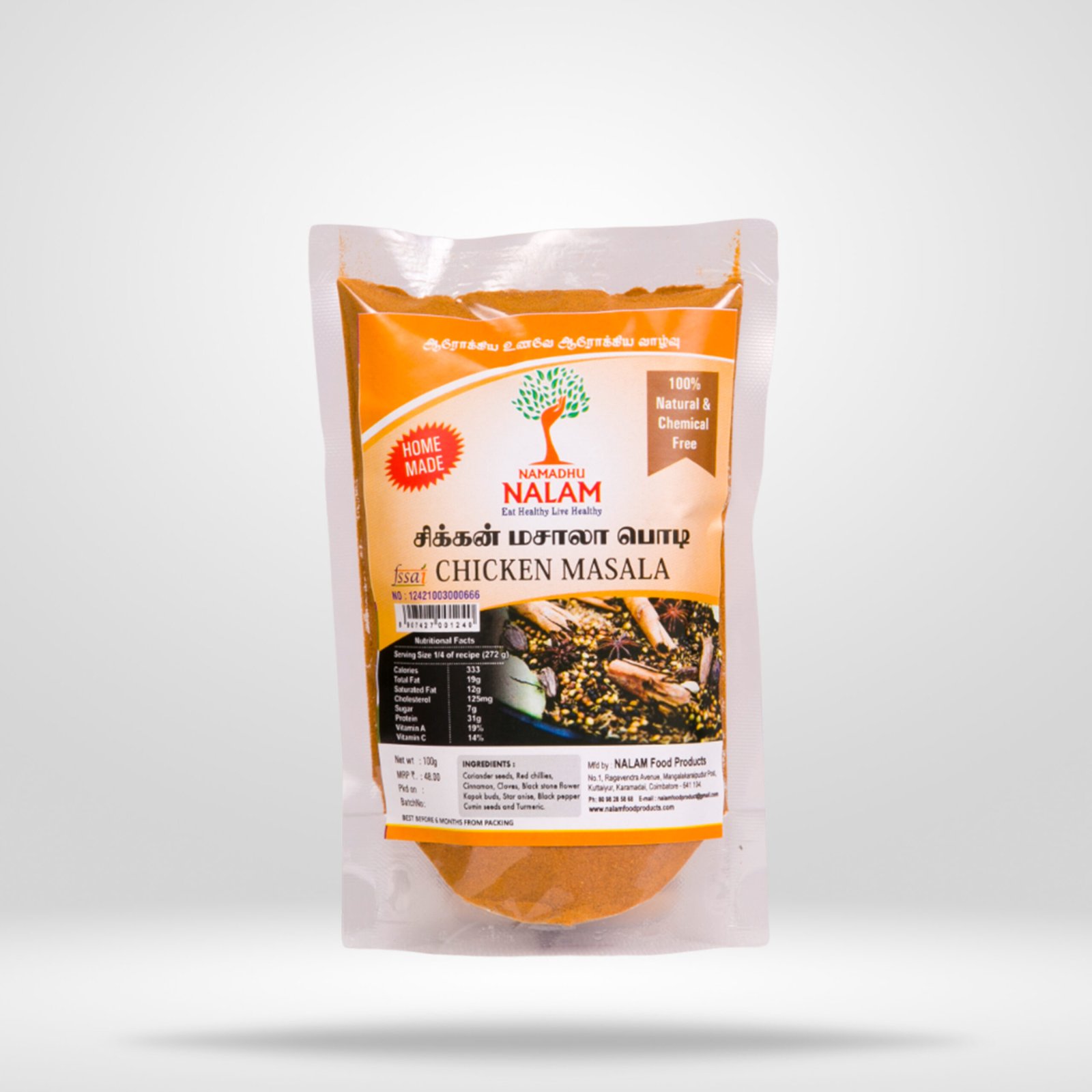 + Shipping Charges ApplicableNALAM Masala products are 100% traditionally homemade with the mixture of country spices. The spices are gently roasted and ground so you can feel the nice aroma of southindian flavour. The masala powders are made with no preservatives and colouring agent. It makes your dishes so delicious.