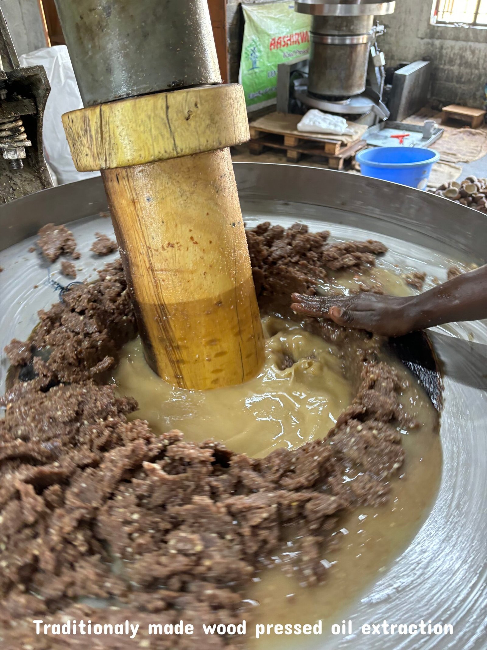 The traditional method of wood pressing involves no external addition of heat. The seeds will be crushed in the wooden axis. most of the heat generated while extraction will be absorbed by the wooden axis also there is no external solvent added during the process. Sesame oil, Coconut oil, Groundnut oil and castor oil are prepared by this method.