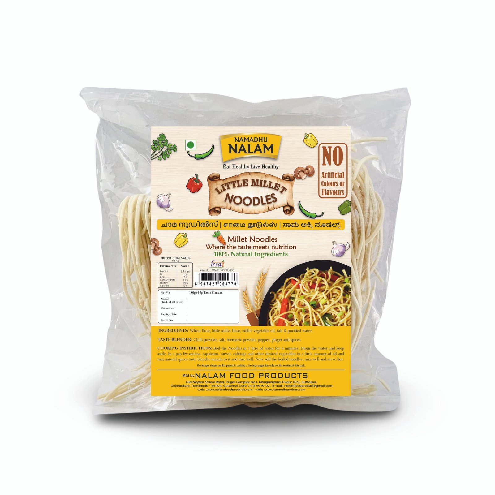 Nalam millet noodles made from first quality millet and wheat flour with no added maida and preservatives.The high fiber content promotes a healthy gut, prevents constipation, and aids in smooth digestion. Millet noodles are a healthy alternative to traditional noodles because they are gluten-free, high in fiber, and have a low glycemic index, which helps regulate blood sugar levels. They are also rich in essential nutrients like iron, calcium, and protein, which support digestion, weight management, and overall well-being.